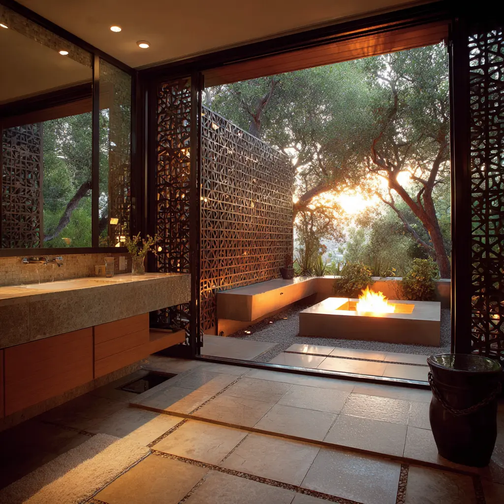Electrochromic glass switches from clear to opaque. Bamboo screens filter light. Strategic planting shields views. Connection without exposure.