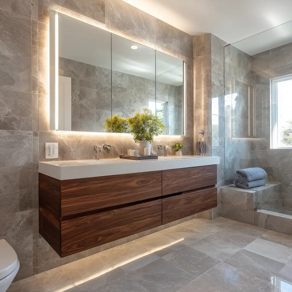 Porcelain tile costs $5–$12 per square foot. Natural stone runs $15–$30. Standard vanity: $800. Custom floating unit: $3,500. LED mirrors with defoggers: $400–$1,200.