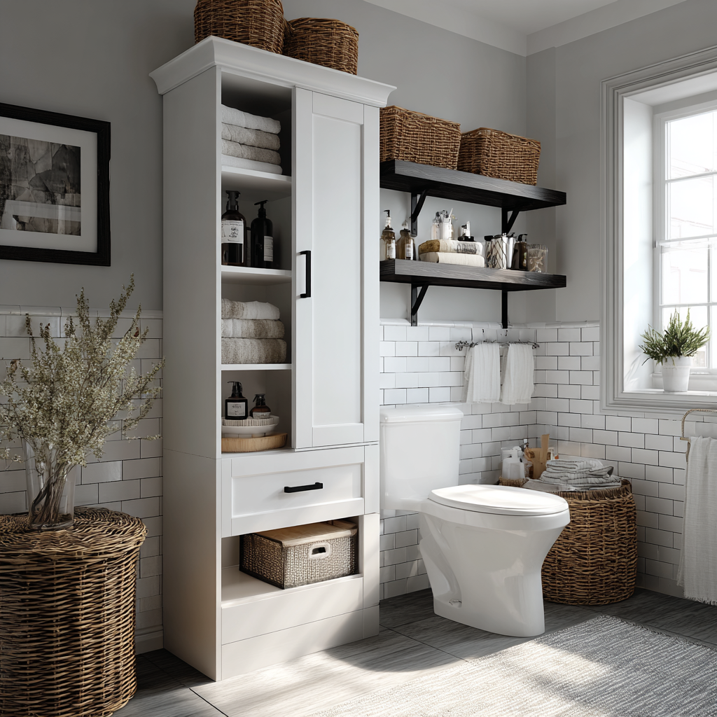 Use height, not width. Install a tall cabinet above the toilet. Add open shelves for baskets. Include a pull-down rod for hanging wet towels. The footprint stays small. Storage capacity triples. This is a classic small bathroom layout idea.Compact Storage That Reaches Up
